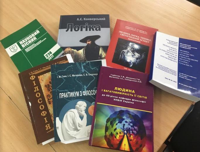 Для кафедри філософії 2017 рік виявився надзвичайно плідним на монографії та посібники. Науковцями кафедри було опубліковано 3 монографії: «Людина і багато вимірність її світів (до 60-річчя кафедри філософії НУБіП України)» (авторський колектив: Горбатюк Т.В., Данилова Т.В., Самарський А.Ю., Матвієнко І.С.), «Концепт природного права в контексті аналізу транзитивних суспільств» (авторський колектив: Культенко В.П., Савицька І.М., Супрун А.Г.) та «Людина, наука, техніка: світоглядний аспект» (авторський колектив: Чекаль Л. А., Горбатюк Т.В., Лук’янець В.С., Самарський А.Ю.).