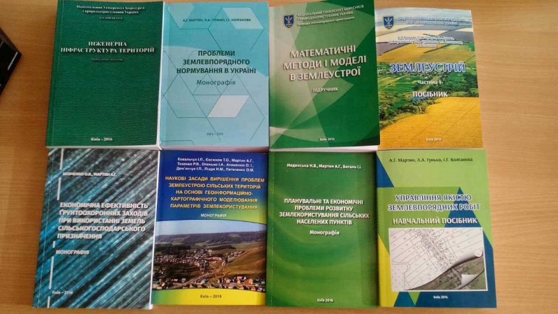 Співробітниками кафедри опубліковані підручники «Математичні методи і моделі в землеустрої» (А.Г. Мартин, О.М. Чумаченко, Є.В. Кривовʼяз), «Історія земельних відносин і землеустрою в Україні» (А.М. Третяк, Т.М. Прядка, І.П. Гетманьчик), навчальні посібники «Управління якістю землевпорядних робіт» (А.Г. Мартин, Л.А. Гунько, І.Г. Колганова), «Інженерна інфраструктура територій» (О.В. Кустовська), «Землеустрій. Частина І» (А.Г. Мартин, Т.М. Прядка, О.В. Кустовська, Л.А. Гунько, О.М. Чумаченко, І.П. Гетманьчик, І.Г. Колганова), «Землевпорядне проектування: організація землекористування структурних елементів екомережі України на місцевому рівні» (А.М. Третяк, В.М. Третяк, Л.А. Гунько), «Землевпорядне проектування. Частина 5» (І.П. Ковальчук, Т.О. Євсюков, Р.В. Тихенко, О.В. Шевченко, А.Г. Мартин), «Реєстрація прав власності на землю» (А.Г. Мартин, О.В. Тихенко).