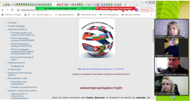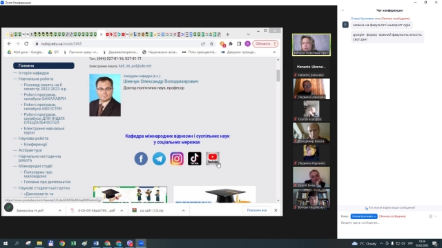 Професор кафедри Олена Любовець доповіла про стан підготовки до Міжнародної очно-дистанційної науково-практичної конференції «Трансформація системи міжнародних відносин в умовах російсько-української війни» (до дня спротиву окупації Автономної республіки Крим та м. Севастополя), що відбудеться 23 лютого 2023 р. і запросила усіх присутніх до участі в ній. Також вона розповіла про розробку спільних наукових проектів із зарубіжними партнерами.