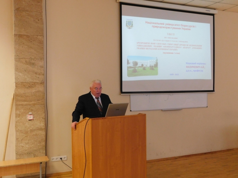 Професор Мазуркевич А. Й. представив звіт на тему "Розробити нові способи стимуляції процесів відновлення ушкоджених тканин опорно-рухомого апарату домашніх тварин методами клітинної терапії", № договору 110/3-пр-2018, строки виконання: 2018–2020, обсяг фінансування на 2018 р. - 850000 грн.