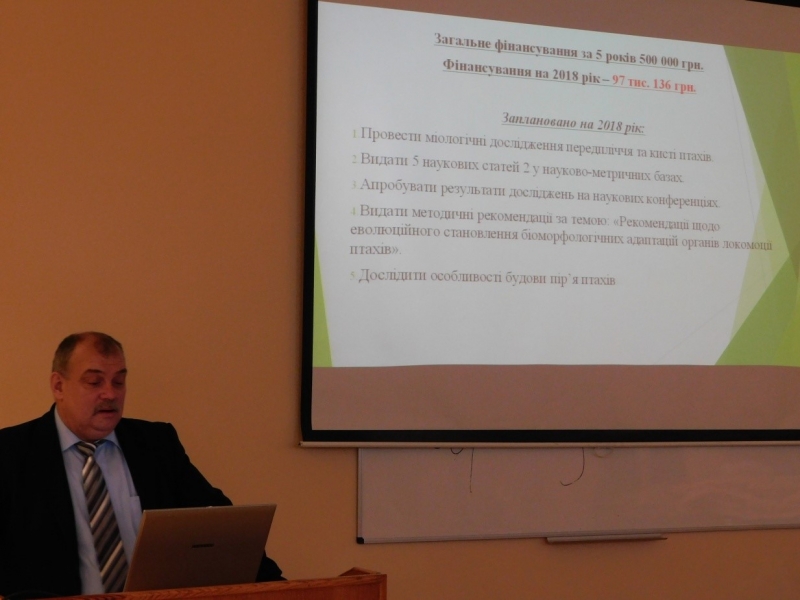 Професор Мельник О. П. представив звіт на тему: “Розробити наукові основи біоморфології органів локомоції птахів”, № договору 110/63-ф, строки виконання: 2014-2018 рр., обсяг фінансування на 2018 р. - 97136 грн.