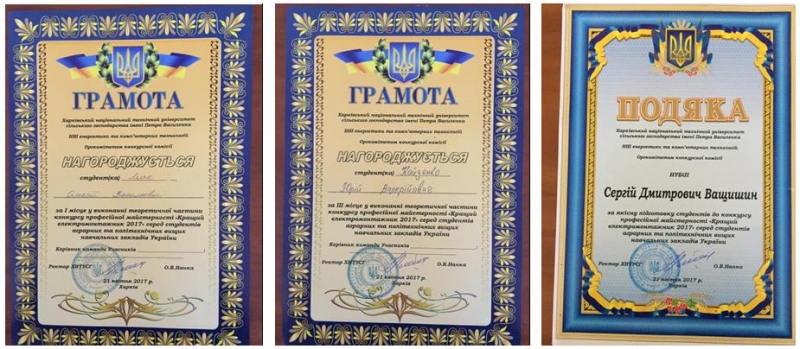 Висловлюємо щиру вдячність нашим студентам і викладачам за достойний рівень знань і практичних навичок. Дякуємо також організаторам конкурсу першому проректору ХНТУСГ ім. П.Василенка, д.т.н., професору Лисиченку М.Л. і директору ННІ енергетики та комп’ютерних технологій, д.т.н., професору Морозу О.М. за чітку організацію конкурсу.