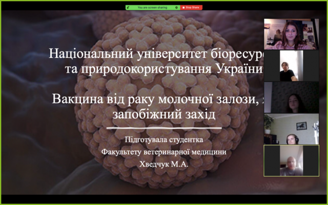 Першою представила свою доповідь студентка 3 курсу факультету ветеринарної медицини Хведчук Марія, яка розповіла про вакцину від раку шийки матки. В презентації був також згаданий німецький медик та вчений, лауреат Нобелівської премії - Гаральд цур Гаузен, що відкрив нову еру в галузі онкозахворювань, збудниками якими є віруси з родини Papillomaviridae.