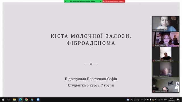 Другою свою доповідь на тему: «Кіста молочної залози. Фіброаденома» представила студентка Перстенюк Софія, яка детально розповіла про методи діагностики цих захворювань. Слід зазначити активність студентів після доповідей, адже обговорення проходило у вигляді дискусії. Кожен міг поставити питання і отримати на нього вичерпну відповідь.
