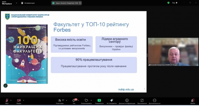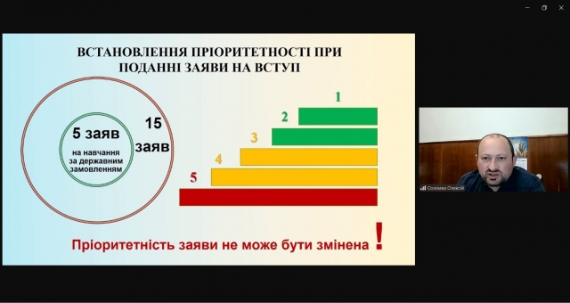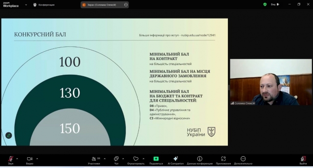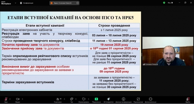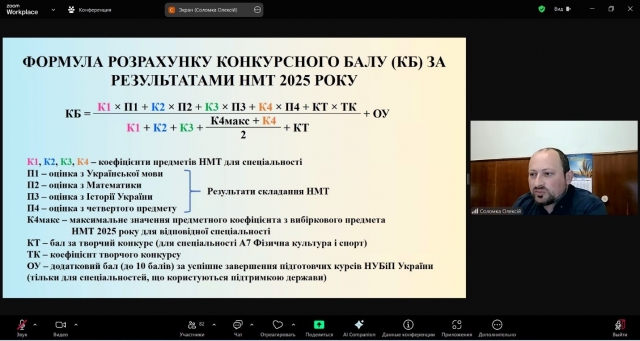 Про особливості вступної кампанії 2025 року розповів відповідальний секретар приймальної комісії НУБіП України Олексій Соломка. Ознайомивши учасників із загальними етапами вступної кампанії, детально пояснив важливі моменти щодо процесу складання національного мультипредметного тесту, правил подачі заяв та встановлення їх пріоритетності, а також умов зарахування на навчання.