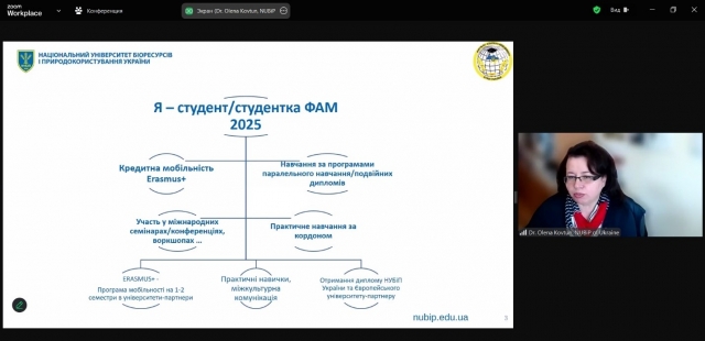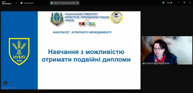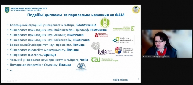У продовження заходу керівник міжнародних програм, завідувач кафедри адміністративного менеджменту та зовнішньоекономічної діяльності Олена Ковтун презентувала учасникам особливості навчання з можливістю отримати подвійні дипломи, перелік міжнародних університетів-партнерів, де можна паралельно навчатися, участь студентів у міжнародних проєктах, конференціях та стажуваннях у країнах ЄС.