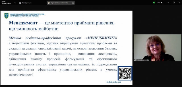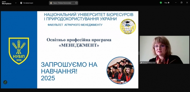 Завідувач кафедри менеджменту ім. проф. Й. С. Завадського Тетяна Балановська розповіла про особливості та переваги навчання на освітньо-професійній програмі «Менеджмент». Окрему увагу Тетяна Балановська акцентувала на атмосфері, у якій навчають студентів на факультеті аграрного менеджменту з використанням різноманітних інноваційних методів. Наприкінці виступу Тетяна Балановська наголосила, що на офіційному сайті Університету і, зокрема, на сторінці кафедри менеджменту ім. проф. Й. С. Завадського, а також на сторінці кафедри у Facebook майбутні абітурієнти та здобувачі вищої освіти завжди можуть ознайомитись із актуальною, цікавою та детальною інформацією, що стосується найрізноманітніших питань діяльності Університету, факультету, кафедри.