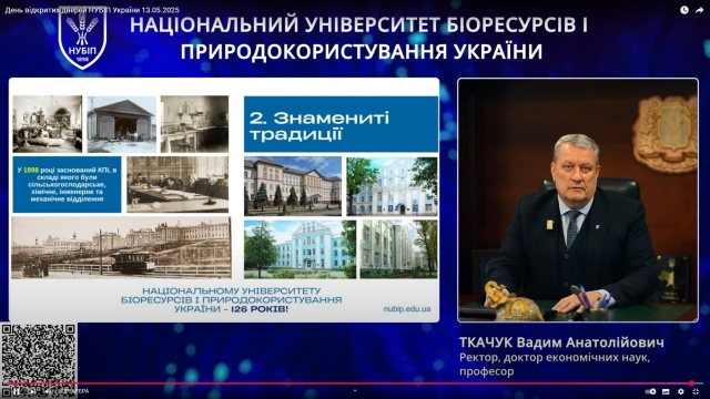 13 травня 2025 року Національний університет біоресурсів і природокористування України в черговий раз провів День відкритих дверей для майбутніх абітурієнтів. Цього разу захід проходив в онлайн форматі. Розпочався День відкритих дверей з презентаційних відеороликів про Університет та навчання на різних освітніх програмах за відповідними спеціальностями. З вітальним словом перед гостями виступив ректор Університету, д.е.н., професор Вадим Ткачук, який наголосив на перевагах навчання у НУБіП України, територіальному розміщенні студентського містечка в одній із наймальовничішій частині Києва, а також розповів про особливості навчання студентів.