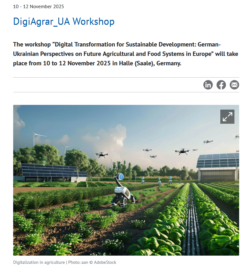 З 10 по 12 листопада 2025 року у місті Халле, Німеччина (Halle/Saale, Germany) відбувся завершальний триденний воркшоп по проекту «Digital Transformation for Sustainable Development: German-Ukrainian Perspectives for Future Agricultural and Food Systemsin Europe» за проектом DAAD-funded projectDigiAgrar_UA.