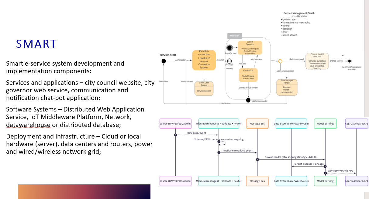 Компоненти розробки та впровадження системи інтелектуального електронного сервісу: Послуги та додатки – сайт міської ради, веб-сервіс мера міста, додаток чат-бот для комунікації та сповіщень; Програмні системи – розподілена служба веб-додатків, платформа проміжного програмного забезпечення IoT, мережа, сховище даних або розподілена база даних. Розгортання та інфраструктура – хмарне або локальне обладнання (сервер), дата-центри та маршрутизатори, живлення та дротова/бездротова мережева мережа. Представлена концепція електронної послуги проектування системи складається з декількох ключових компонентів – модулів, інформаційної системи, веб-порталу, систем розумної обробки завдань і станів та інших.