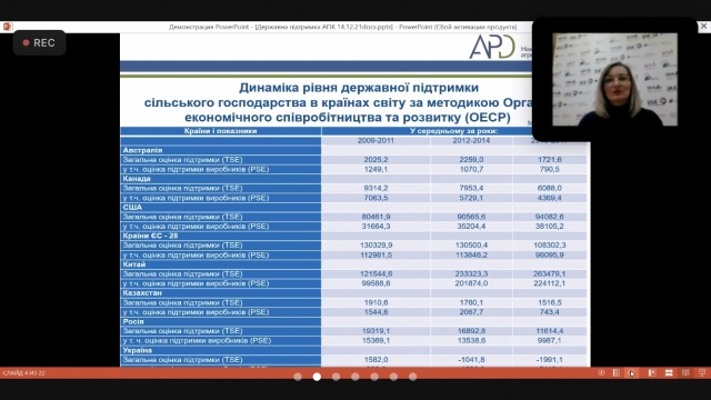 Серед співробітників кафедри до роботи заходу долучився доцент Олександр Файчук. У свою чергу, головним лектором на круглому столі виступила експертка APD Людмила Ставнича, яка конструктивно у своїй презентації представила ретроспективний аналіз стану державної підтримки українського сільського господарства, а також надала конкретні пропозиції щодо подальшого її вдосконалення. Проводячи компаративний аналіз між Україною та деякими іншими країнами світу за методикою ОЕСР, експертка зазначила, що нинішня державна підтримка аграрного сектору в нашій державі не є ефективною і спрямована на досягнення переважно короткострокових цілей й характеризується щорічною зміною векторів.