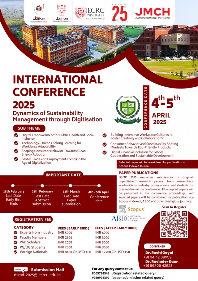 4-5 квітня у JECRC University (Індія) відбулася Міжнародна конференція ‘Dynamics of Sustainability Management through Digitalization (DSMD25)’, метою якої було обговорення проблем і викликів сталого розвитку зростання через інтеграцію технологій, інновацій та екологічних стратегій для просування сталого розвитку, зменшення відходів та підвищення соціальної відповідальності.