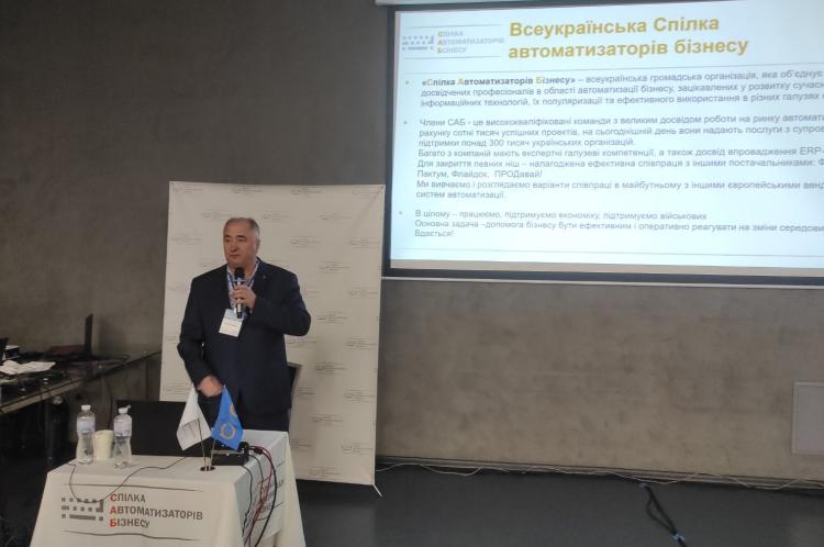 З вітальним словом до учасників конференції звернувся Вадим МАЗУР, голова «Всеукраїнської Спілки Автоматизаторів Бізнесу». Він зауважив, що робота конференції буде поділена на блоки. Учасники конференції отримають актуальну інформацію про аналіз сучасного стану та перспектив розвитку ІТ-ринку, зокрема місця України в глобальному ІТ-середовищі, огляд тенденцій автоматизації корпоративного ринку у 2025 році, практичні аспекти еволюції ERP-проєктів та ролі управлінського консалтингу, застосування сервісів електронного підпису та забезпечення достовірності даних, можливості та ризики використання штучного інтелекту в бізнесі, практику впровадження ШІ-асистентів у BAS, інструменти управління запасами, грошовими потоками, складською логістикою та продажами, кейси автоматизації казначейства, автопарків, дистрибуції, актуальні вимоги до подання звітності у форматі SAF-T UA, підходи до оптимізації витрат володіння ERP-системами, партнерські моделі впровадження BAS ERP та багато іншого.