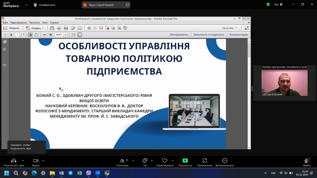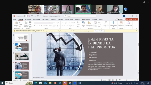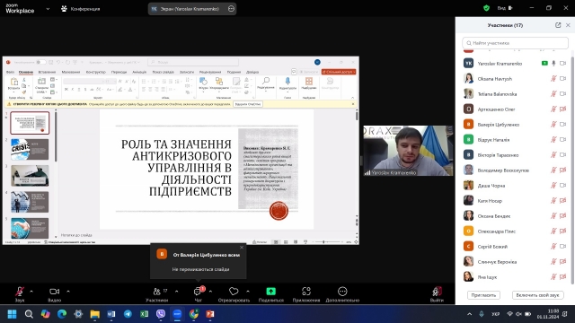 Крамаренко Ярослав, здобувач другого (магістерського) рівня вищої освіти зі спеціальності «Менеджмент організацій і адміністрування», представив доповідь на тему «Роль та значення антикризового управління в діяльності підприємств» та приділив увагу визначенню ролі й місця антикризового управління в умовах значної динаміки зовнішнього середовища. Тема виявилось надзвичайно актуальною, свідченням чого стали поставлені запитання до доповідача та доповнення учасників конференції.