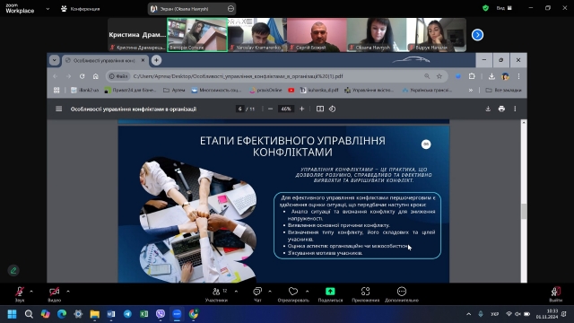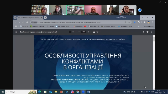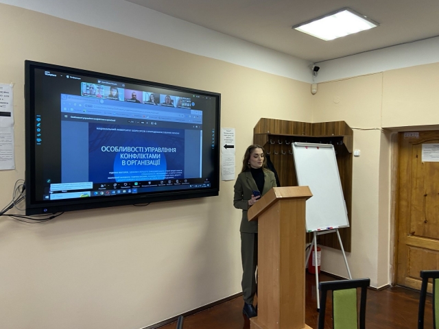 Сіденко Вікторія, здобувач першого (бакалаврського) рівня вищої освіти зі спеціальності «Менеджмент», представила доповідь на тему «Особливості управління конфліктами в організації», у якій зробила акцент на вивченні психологічних особливостей конфліктів в організаціях і визначення методів їх розв’язання.