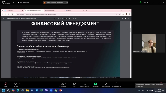 Тарасенко Вікторія, здобувач першого (бакалаврського) рівня вищої освіти зі спеціальності «Менеджмент», виступила на конференції з доповіддю на тему «Особливості фінансового менеджменту підприємств», під час якої висвітлила особливості фінансового менеджменту в умовах воєнного стану, що супроводжується високим рівнем ризику ведення бізнесу. Представлене питання викликало жваву дискусію та обговорення.