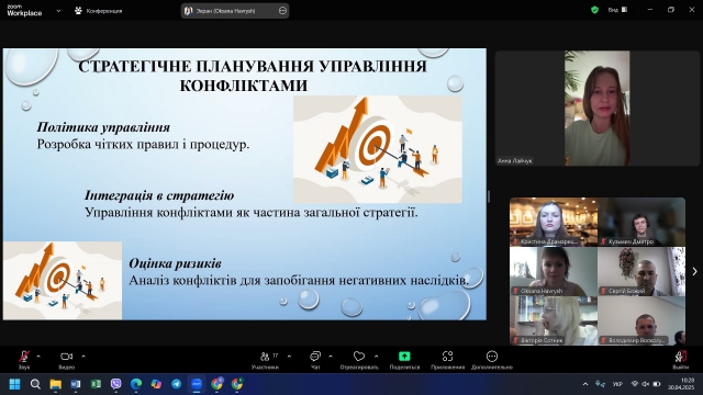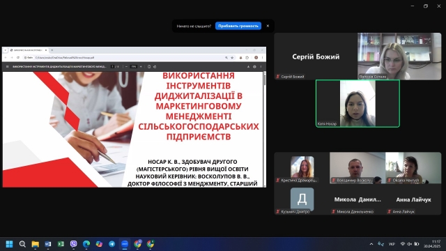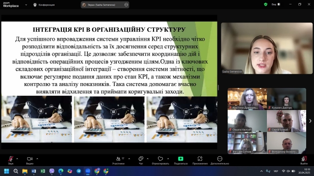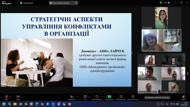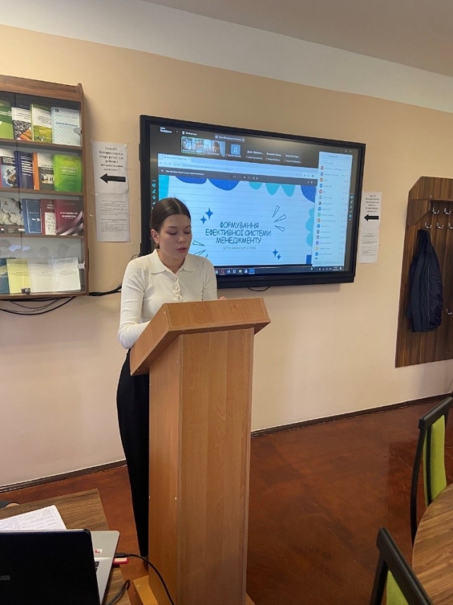 Мужиловська Марія, здобувач першого (бакалаврського) рівня вищої освіти зі спеціальності 073 «Менеджмент», представила доповідь на тему «Сучасні технології управління персоналом», у якій зробила акцент на вивченні особливостей управління персоналом підприємства під впливом різних внутрішніх і зовнішніх умов.