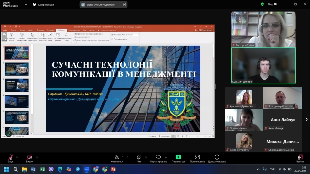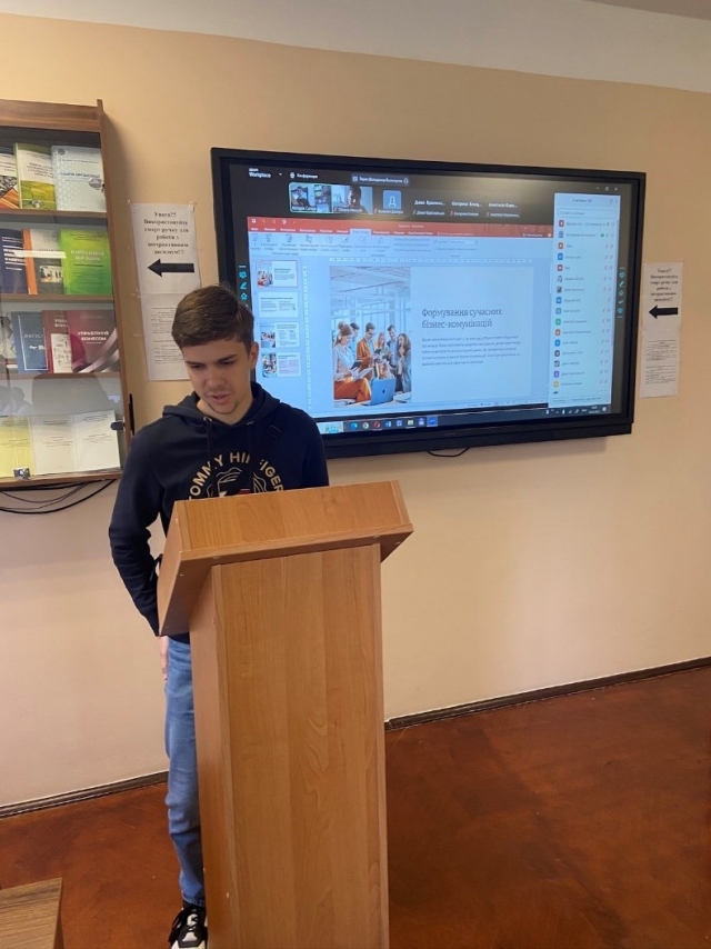 Нужденко Георгій, здобувач першого (бакалаврського) рівня вищої освіти зі спеціальності 073 «Менеджмент», представив доповідь на тему «Формування сучасних бізнес комунікацій» і приділив увагу визначенню ролі комунікацій у системі управління в умовах значної динаміки зовнішнього середовища. Тема виявилась особливо актуальною з огляду на поставлені доповідачу запитання та доповнення учасників конференції.