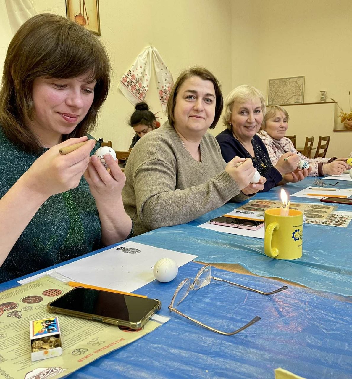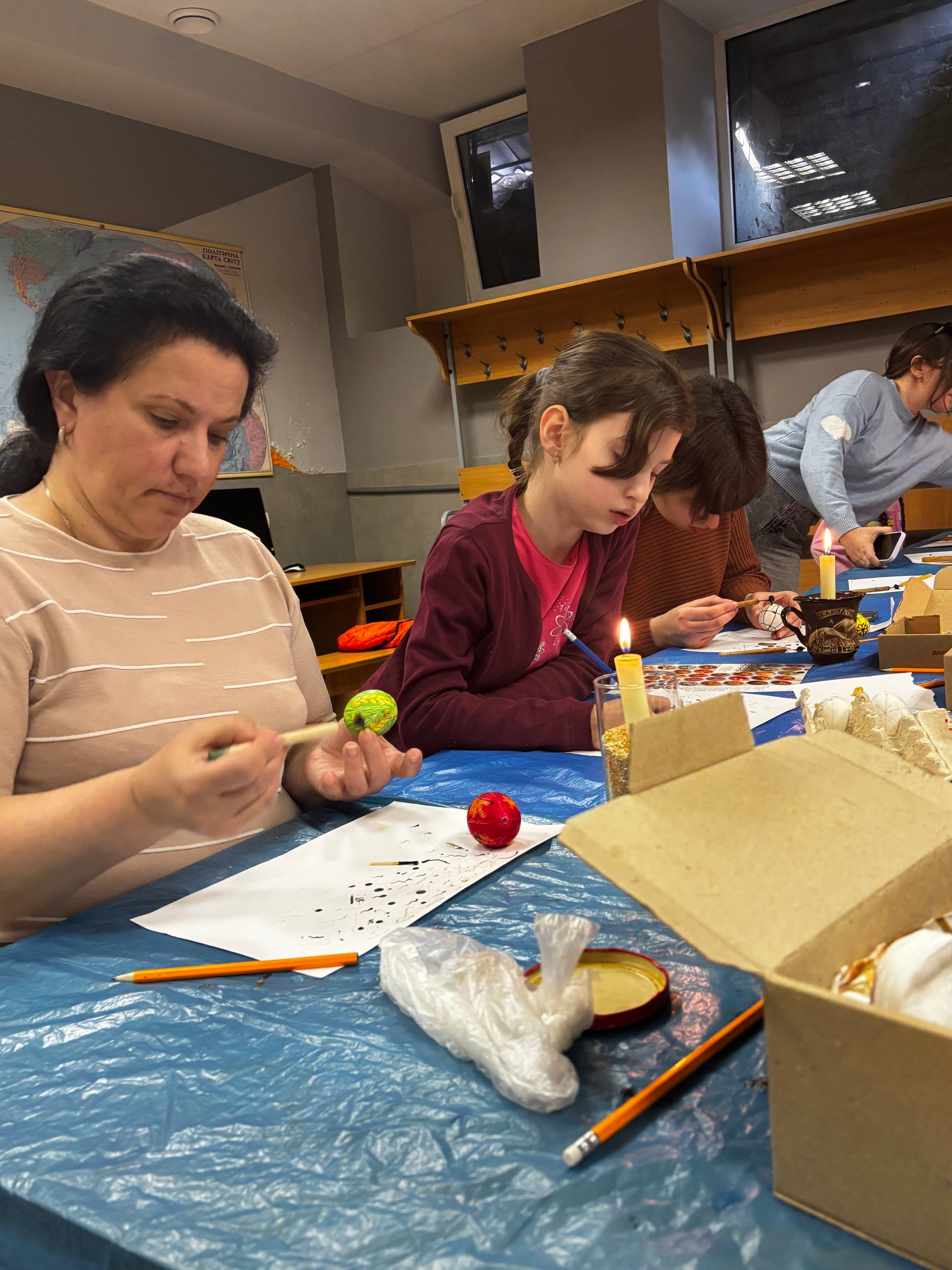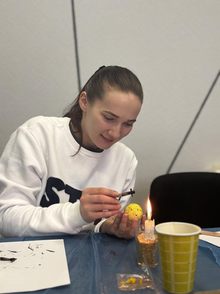 Навіть під час повітряних тривог майстер-класи продовжувалися в укритті — з дотриманням усіх заходів безпеки, але з тією ж атмосферою зосередженості та натхнення. Але й там панувала тиша, зосередженість і натхнення – писанкарство ставало способом відволіктися, відновити внутрішній баланс і відчути єдність.