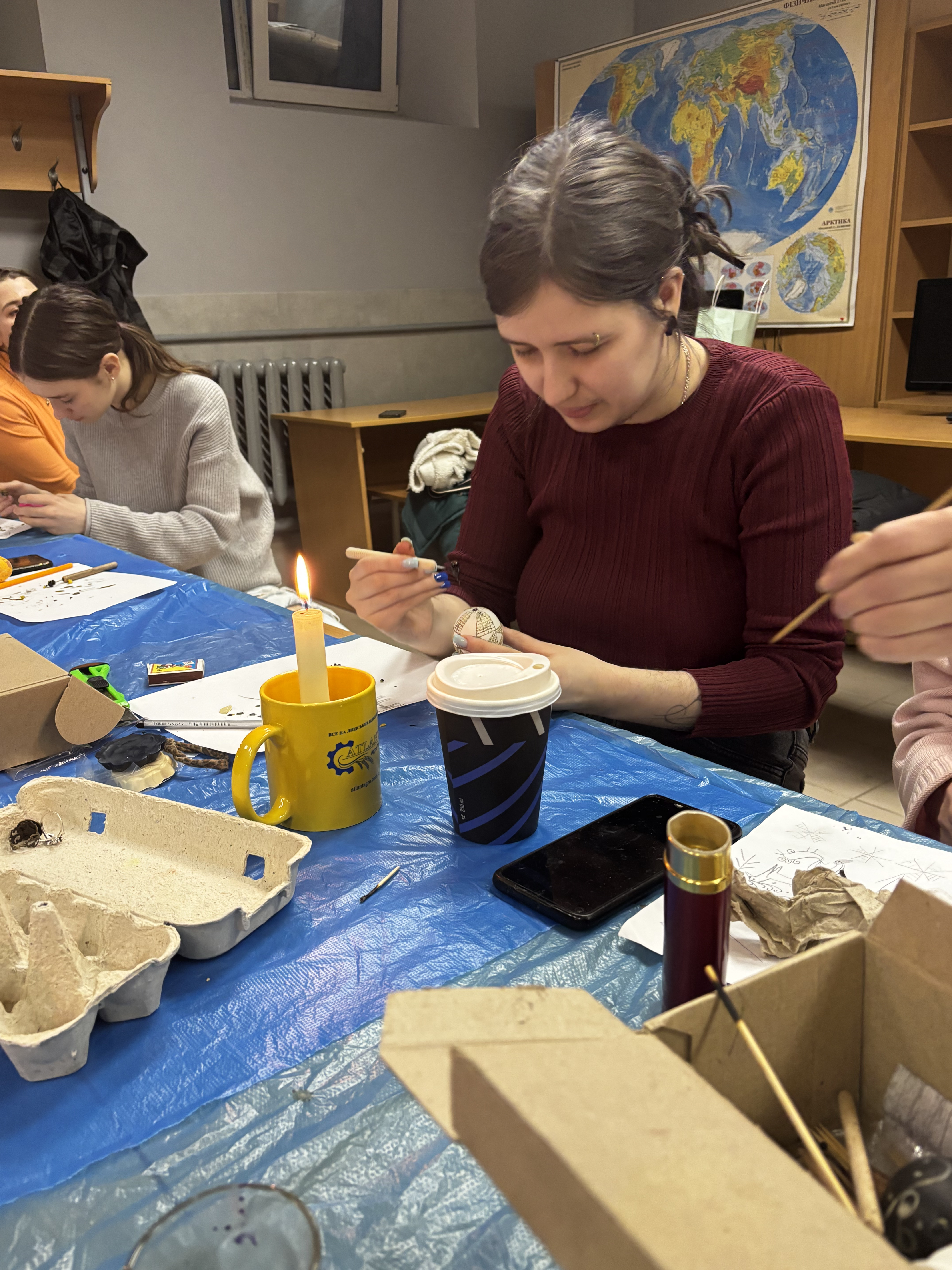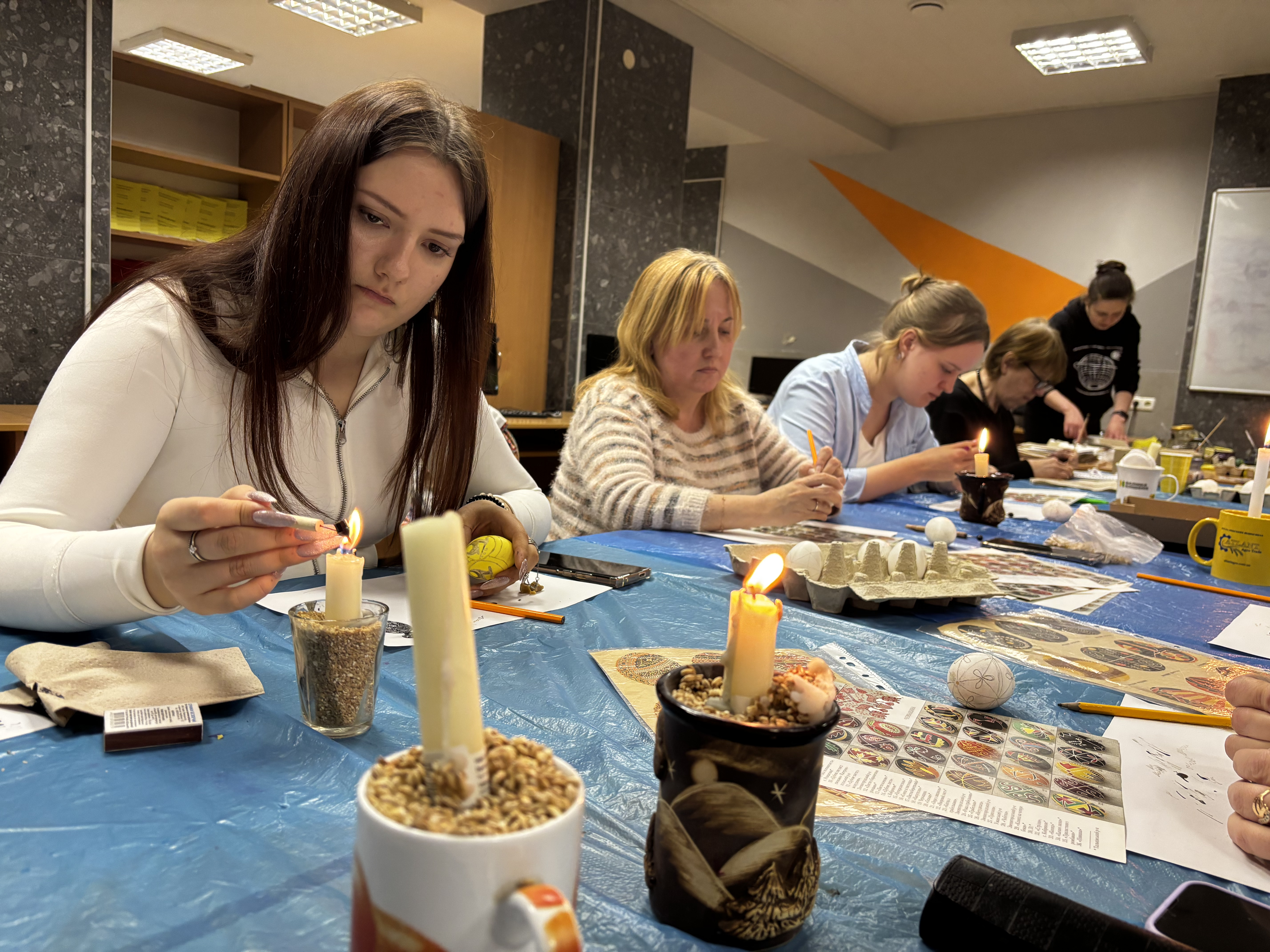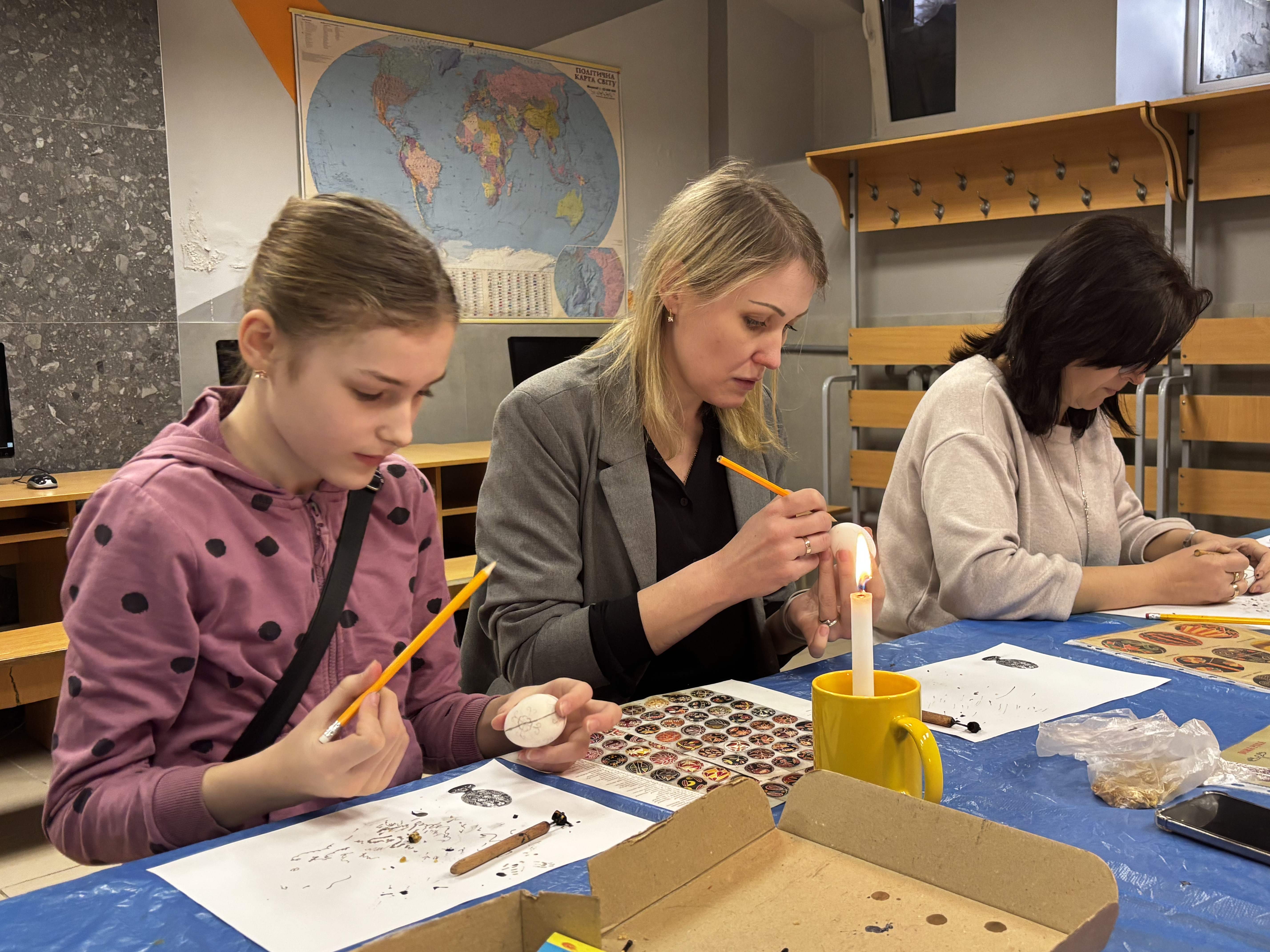 Навіть під час повітряних тривог майстер-класи продовжувалися в укритті — з дотриманням усіх заходів безпеки, але з тією ж атмосферою зосередженості та натхнення. Але й там панувала тиша, зосередженість і натхнення – писанкарство ставало способом відволіктися, відновити внутрішній баланс і відчути єдність.