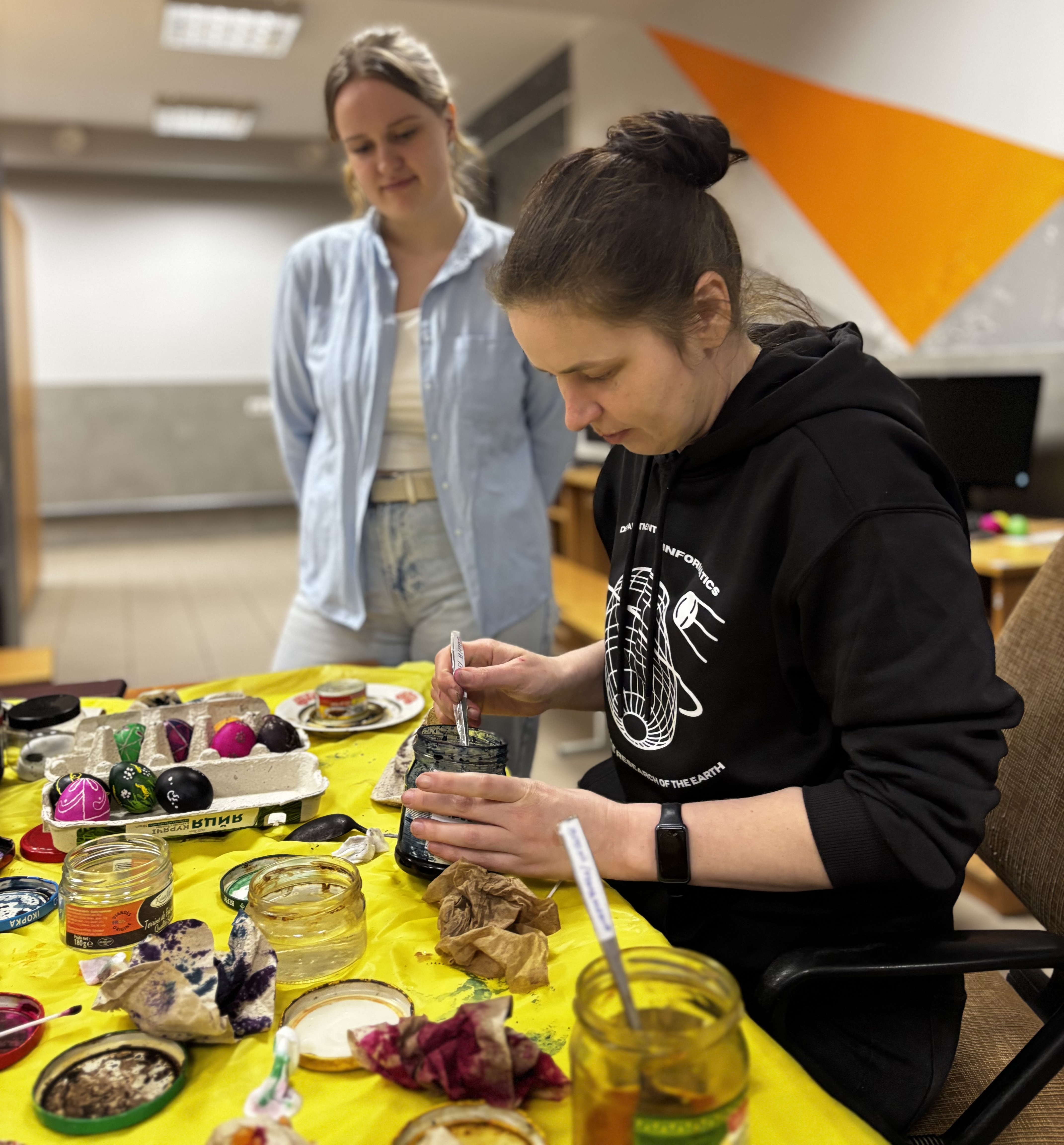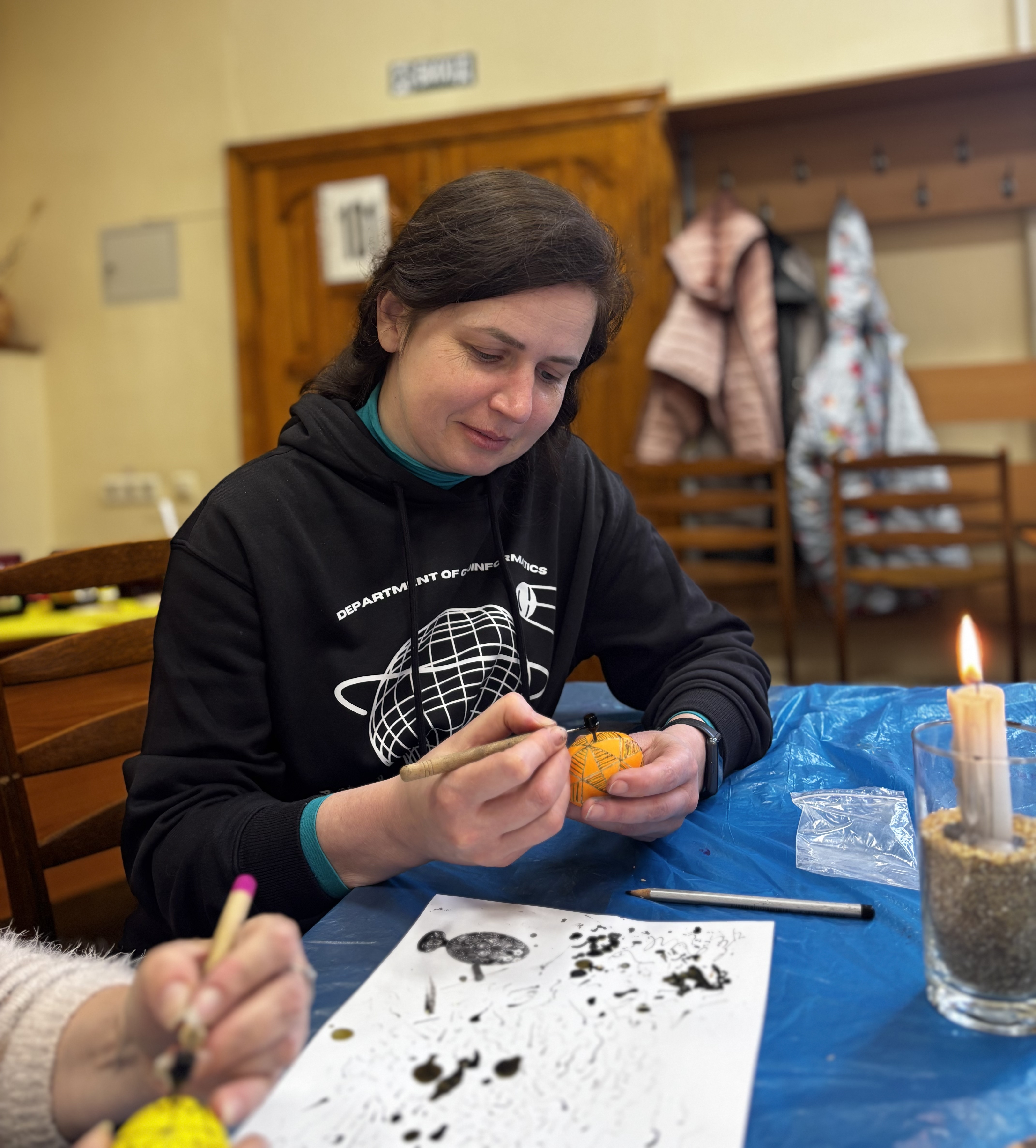Цьогоріч відбулося 5 майстер-класів у різних локаціях: у бібліотеці, укритті, на кафедрі та навіть у початковій школі «Барвінок» м. Києва. До них долучилися студенти, викладачі, співробітники, діти та випускники факультету. Загалом 60 учасників створили 116 писанок — кожна з яких стала відображенням індивідуальності, настрою та віри у майбутнє.