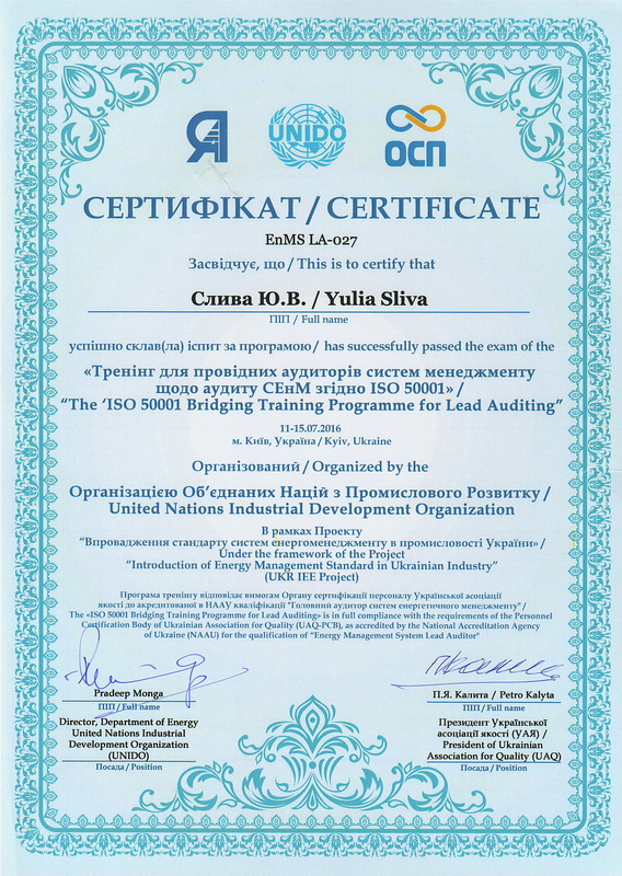 За результатами навчання слухачі повинні були скласти іспит за програмою тренінгу, яка відповідає вимогам до акредитованої в НААУ кваліфікації “Ведучий аудитор систем енергоменеджменту”, яка визнається в країнах Євросоюзу. Юлія Слива успішно склала іспит підтвердила свою компетентність та отримала Сертифікат.