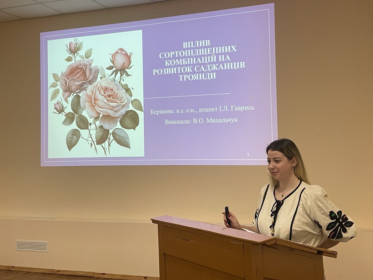 Першою поділилася результатами своєї роботи Михальчук Валентина. Вона досліджувала тему «Вплив сортопідщепних комбінацій на розвиток саджанців троянди» під керівництвом доцента кафедри овочівництва і закритого ґрунту Гаврись І. Л.