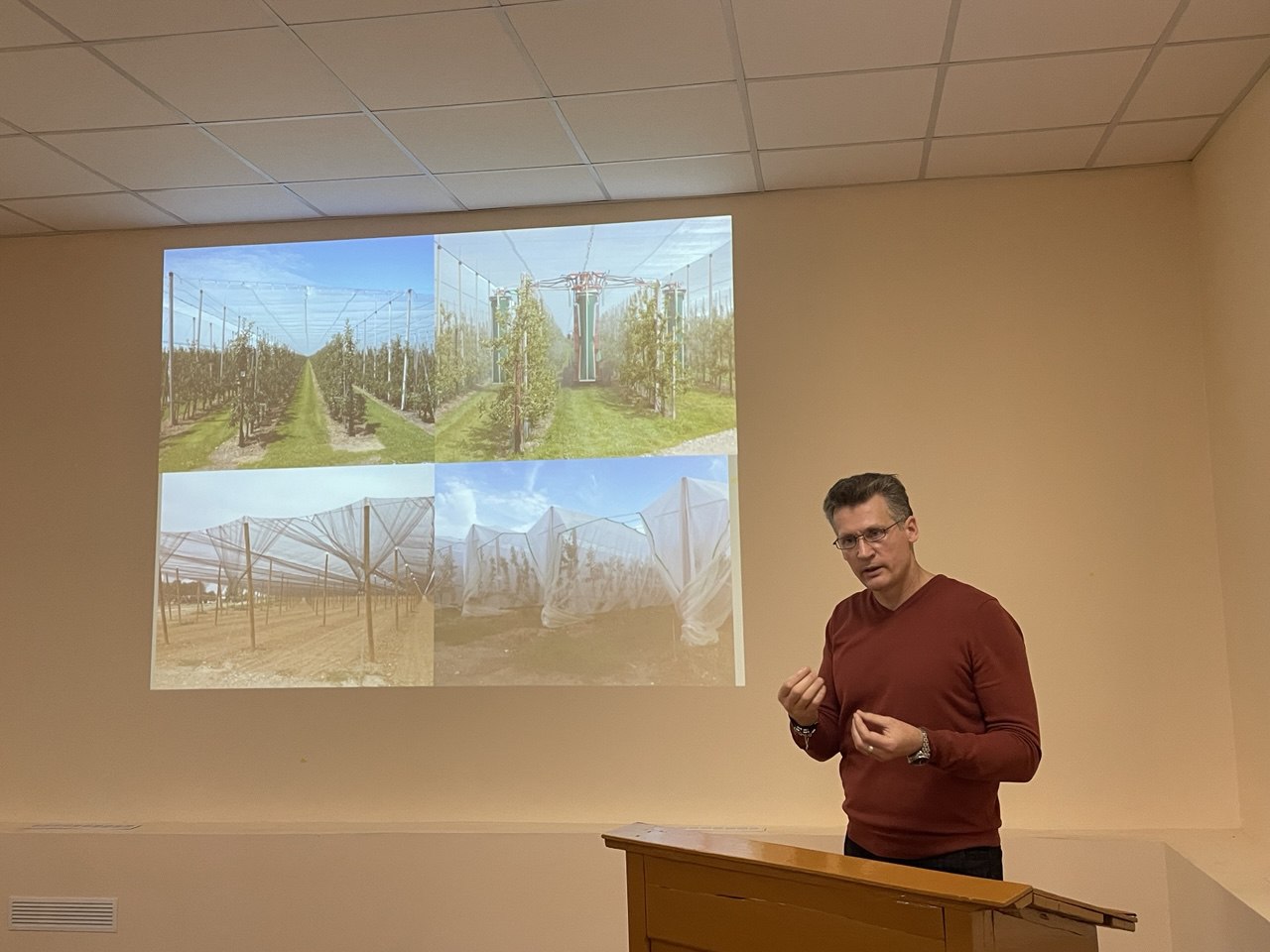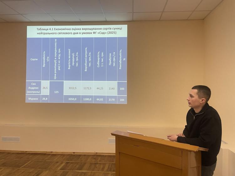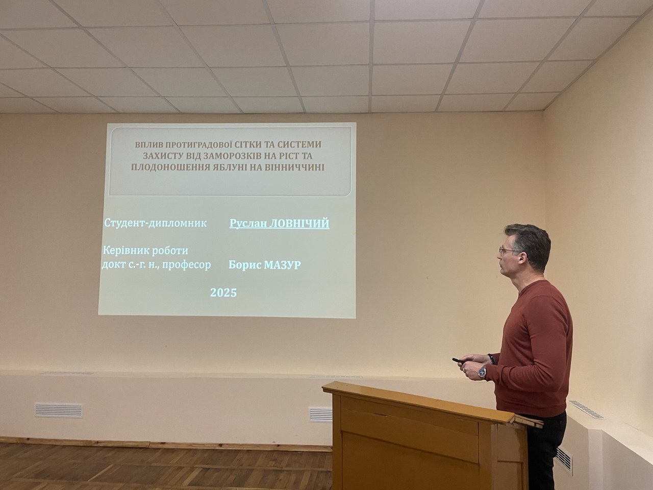 Про результати дослідження впливу сучасних технологічних рішень на ріст і плодоношення садових культур доповів Ловнічий Руслан. Під науковим керівництвом доцента Мазура Б.М. він працював над темою «Вплив протиградової сітки та системи захисту від заморозків на ріст та плодоношення яблуні на Вінниччині». Він представив переконливі дані щодо економічної ефективності цих технологій у великих садах.