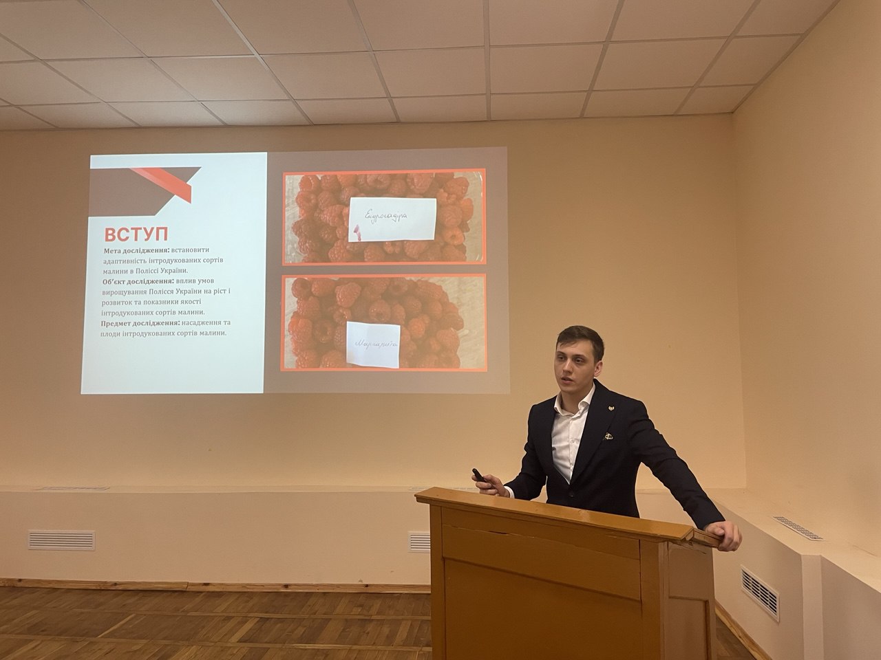 Наступним представив свою наукову роботу Корнюшенко Руслан. Під керівництвом професора Шевчук Л.М. він виконував дослідження на тему «Адаптивність інтродукованих сортів малини в умовах Полісся України». У доповіді здобувач розкрив особливості поведінки нових сортів у змінних кліматичних умовах регіону, наголошуючи на їхній продуктивності та стійкості.