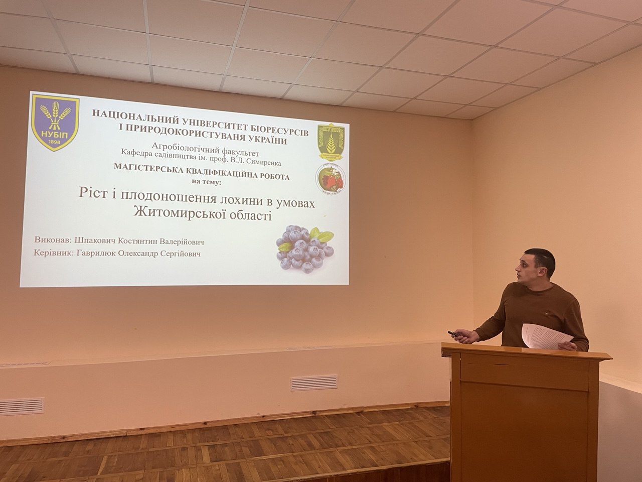 До презентації долучився Шпакович Костянтин, який під керівництвом доцента Гаврилюка О.С. досліджував тему «Ріст і плодоношення лохини в умовах Житомирської області». У своїй роботі він представив результати оцінки адаптивних властивостей цієї культури та факторів, що впливають на її врожайність.