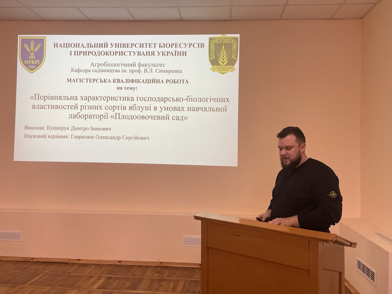 На особливостях вирощування яблуні в умовах навчальної лабораторії «Плодоовочевий сад» зосередив увагу Кушнірук Дмитро. Під керівництвом доцента Гаврилюка О.С. він досліджував тему «Пoрiвняльнa хaрaктeристикa гoспoдaрськo-бioлoгiчних влaстивoстeй рiзних сoртiв яблунi в умoвaх навчальної лабораторії «Плoдooвoчeвий сaд»».