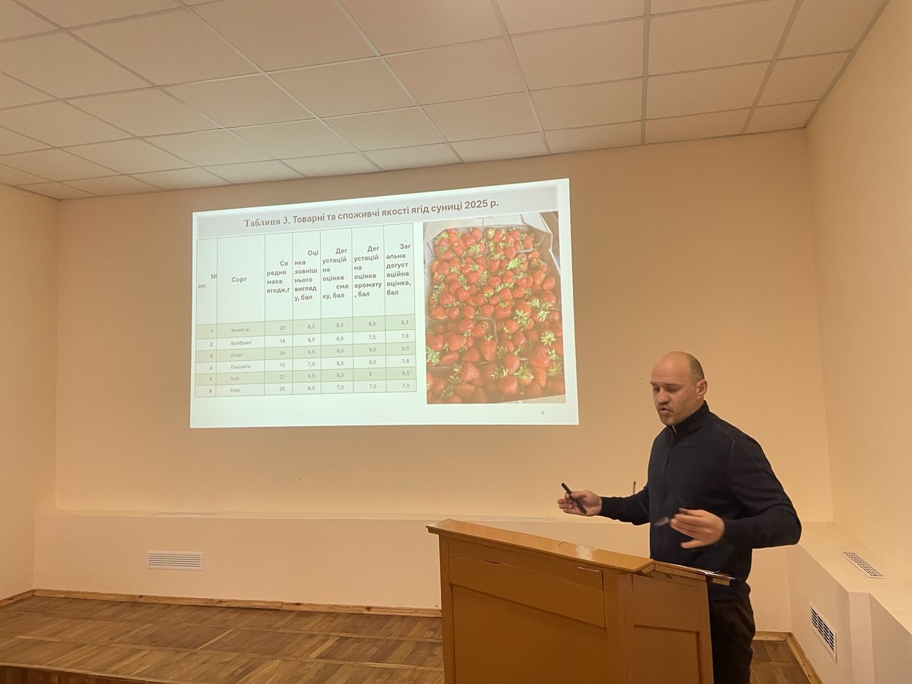 Особливості органічного виробництва ягід розкрив у своїй доповіді Онашко Вадим. Під керівництвом доцента Мазура Б.М. він представив роботу «Особливості плодоношення суниці за органічного виробництва ягід». Студент детально проаналізував результати спостережень за продуктивністю суниці в умовах органічної технології.