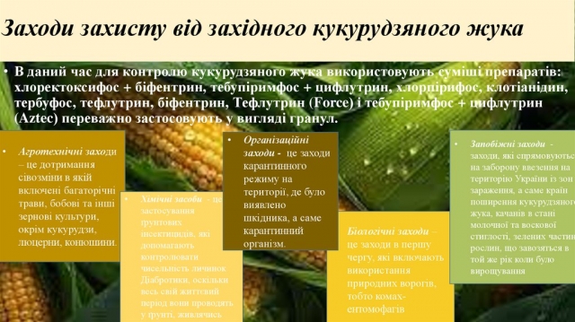 Роман Шевчук зазначив, що необхідно проводити систематичний моніторинг посівів кукурудзи за допомогою ґрунтових розкопок та феромонних пасток для своєчасного виявлення ЗКЖ та проведення своєчасних фітосанітарних заходів. Він підкреслив, що найсильніше шкода від кукурудзяного жука проявлена на полях де відсутня сівозміна. За беззмінного вирощування кукурудзи щільність популяції даного карантинного організму сильно зростає. Тому, один з найбільш ефективних агротехнічних заходів боротьби з діабротикою є сівозміна.