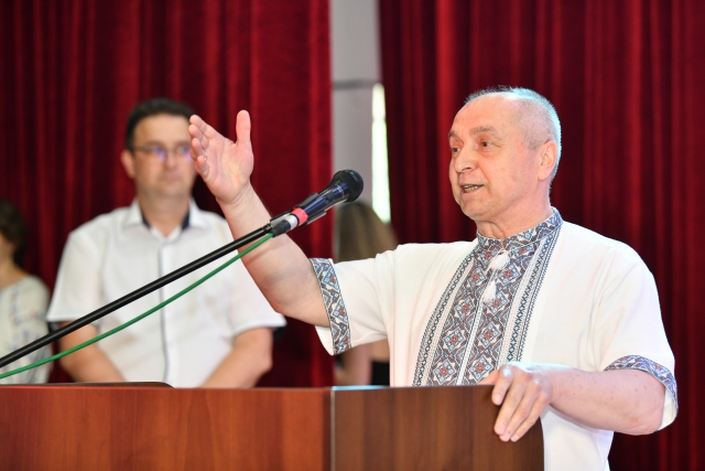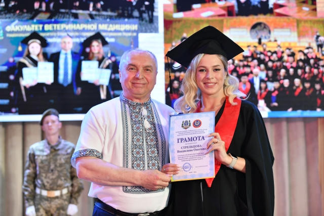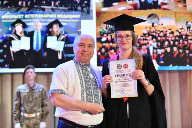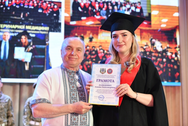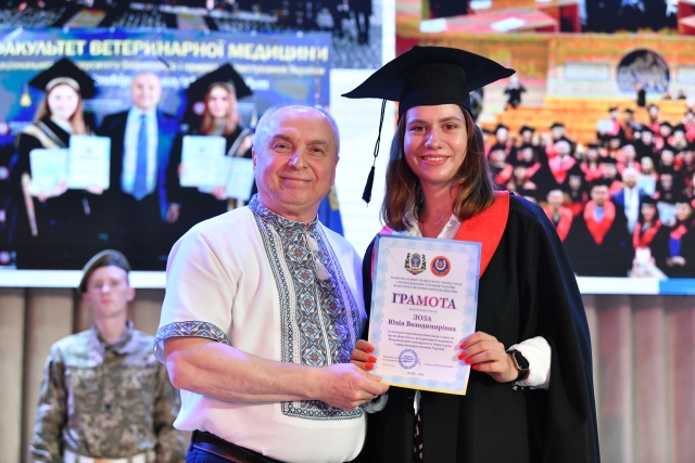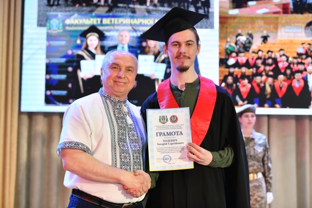 З вітальним словом до випускників і їх батьків, звернувся декана факультету ветеринарної медицини академіка НААН України Миколи Цвіліховського. Він привітав випускників з початком нового етапу їх життя, побажав успішної кар’єри, міцного здоров’я та реалізації планів і задумів. Наголосив, що сьогодні перед випускниками відкриваються нові життєві обрії. Нехай вони будуть ясними, а диплом випускника факультету ветеринарної медицини Національного університету біоресурсів і природокористування України стане не просто документом про вищу освіту, але й надійним провідником на професійному шляху, предметом гордості і знаком приналежності до багатотисячної родини лікарів ветеринарної медицини. Побажав міцного здоров’я, мирного неба та нашої найшвидшої перемоги.