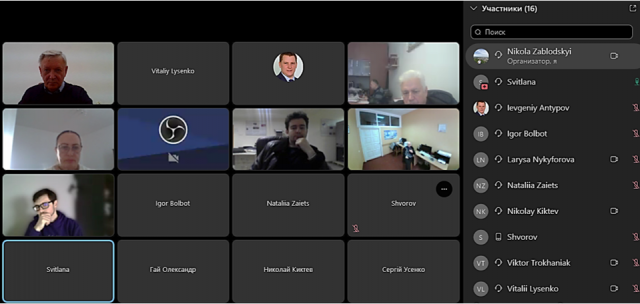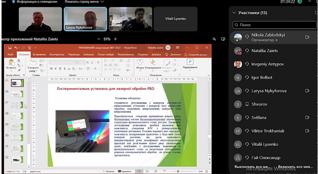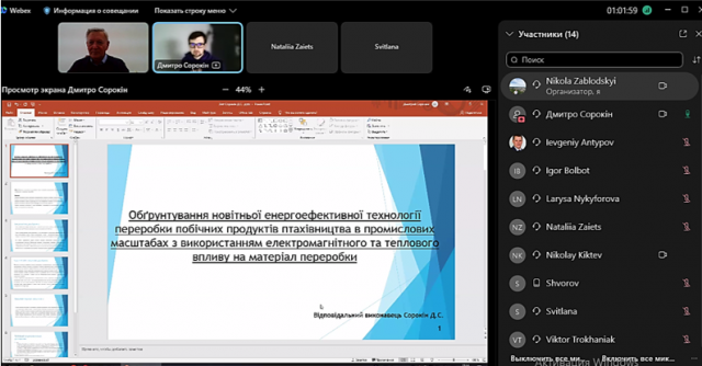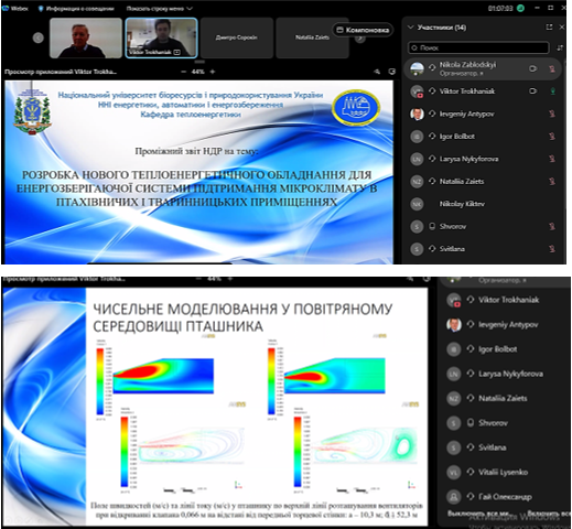 Канд. техн. наук, доц. Дмитро Сорокін доповів про виконання НДР базового фінансування на тему «Підвищення ефективності технологічного процесу переробки кератиновмісних побічних продуктів птахівництва в промислових масштабах». На фізичних моделях з додатковим використанням моделювання в середовищі комплексу COMSOL Multiphysics здійснено оптимізацію режимних параметрів гідротермічного процесу переробки кератинової сировини в середовищі високої температури та високого тиску з впливом електромагнітного поля та вібраційних коливань. За цією тематикою підготовлена заявка на участь у конкурсі науково-технічних розробок за державним замовленням на 2023 рік.