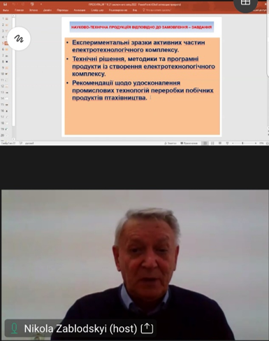 Завершена науково-дослідна робота «Розробка електротехнологічного комплексу з гібридною системою енергозабезпечення для переробки побічних продуктів птахівництва у паливо, біологічні корми та добрива», яка виконувалась під науковим керівництвом д-ра техн. наук, проф. Миколи Заблодського. Запропоновані структурні, алгоритмичні і технічні рішення (22 патенти України на винаходи і корисні моделі) та програмні продукти зі створення електротехнологічного комплексу з гібридною системою енергозабезпечення та інноваційної системи переробки побічних продуктів птахівництва. Виготовлені діючі експериментальні зразки окремих активних частин технологічних ліній та відпрацьовані технології анаеробної переробки посліду, високошвидкісної відцентрової переробки посліду та гідротермічної обробки пухо-пір'яних відходів.