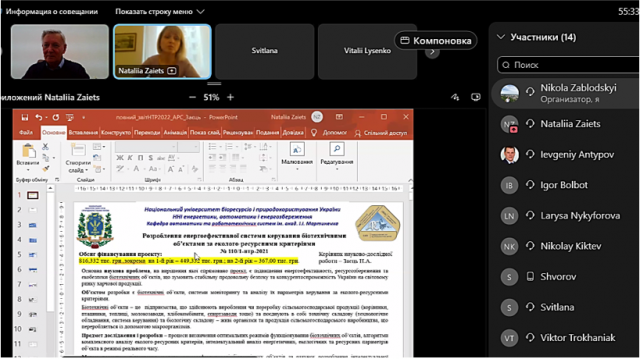 Під науковим керівництвом д-ра техн. наук, проф. Наталії Заєць завершена науково-дослідна робота «Розроблення енергоефективної системи керування біотехнічними об’єктами за еколого-ресурсними критеріями». Створено алгоритмічне та програмне забезпечення для нейромережевої математичної моделі оцінки енергоефективності біотехнічних обєктів в умовах невизначеності. Розроблено інтелектуальну систему підтримки прийняття рішень на основі контролю та моніторингу еколого-ресурсних параметрів біотехнічного об’єкта, що направлена та мінімізацію ресурсо- та енерговитрат. Розроблено рекомендації для підприємств України з виробництва та переробки сільськогосподарської продукції щодо впровадження енергоефективної системи керування біотехнічними об’єктами за еколого-ресурсними критеріями.