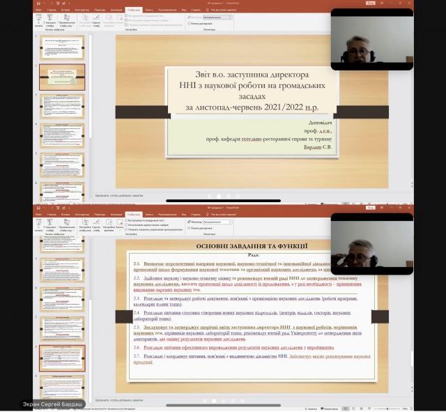 У звіті в.о. заступника директора ННІ НОіТ з наукової роботи на громадських засадах, а також головиНаукової ради, д.е.н., проф. Сергія Бардаша було акцентовано увагу на видах робіт, що були виконані протягом звітного періоду, а також основних завданнях та функціях Наукової ради, на здобутках та напрямах наукової роботи, які можливі для реалізації в особливий період воєнного стану.