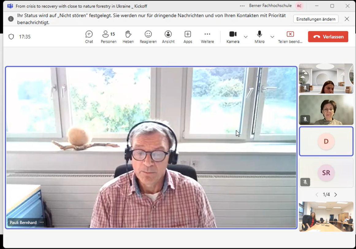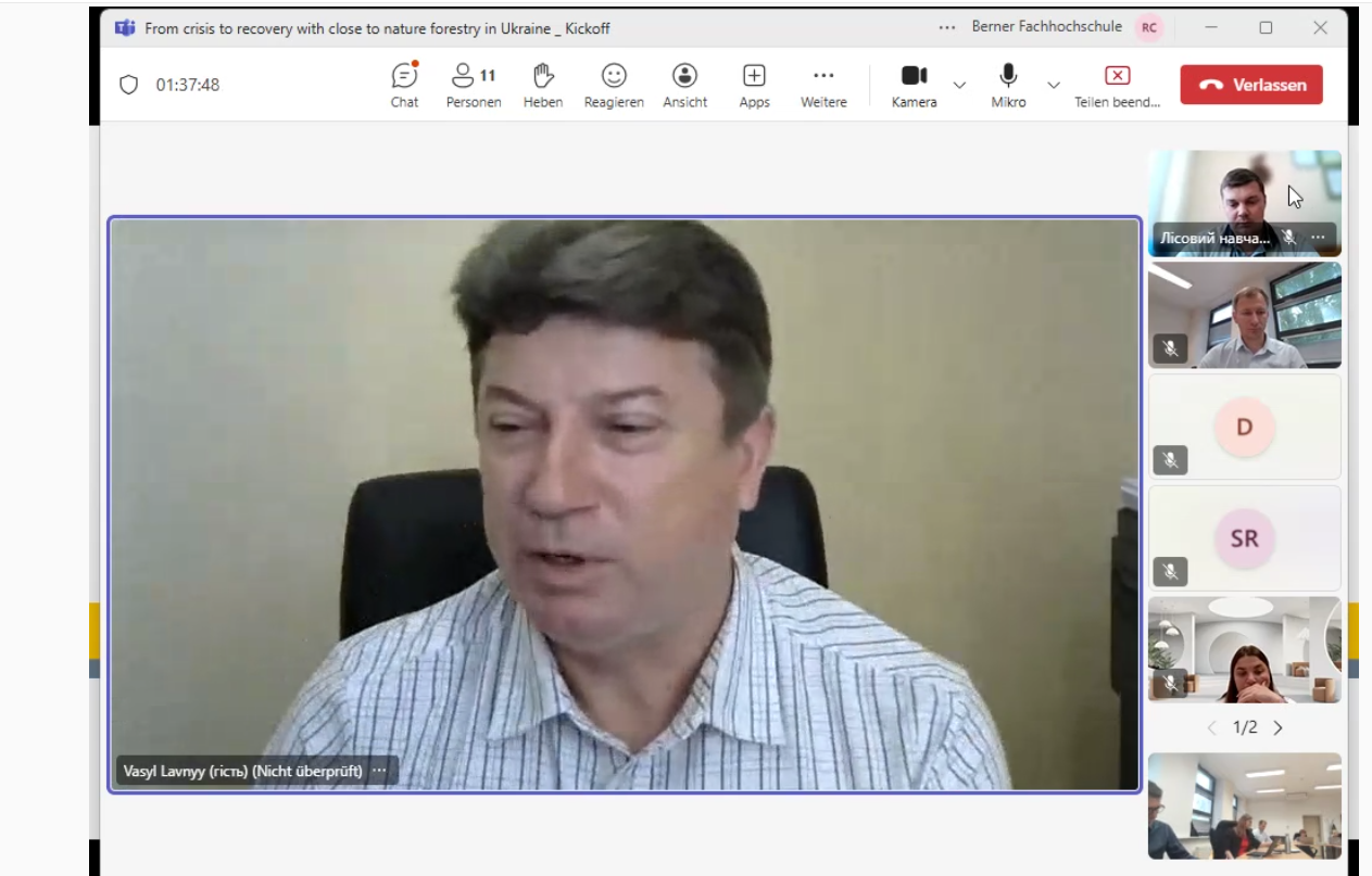 Під час стартової зустрічі Мар’яна Мельникович (BFH-HAFL), Крістіан Россет (Christian Rosset, BFH-HAFL), Олександр Сошенський (НУБіП України), Ганна Лобченко (WWF-України), Петро Дячук (ПНУ) та Леся Лойко (FORZA) представили короткі доповіді, у яких розповіли про концепцію проєкту та внесок своїх організацій у його реалізацію. Виступи були присвячені стратегічним цілям проекту, впровадження в Україні принципів наближеного до природи лісівництва, створення мережі демонстраційних ділянок (мартелоскопів), розробки освітніх ресурсів і онлайн-курсів для лісівників та студентів, а також налагодження міжнародного партнерства задля відновлення українських лісів після війни та підвищення їхньої стійкості до змін клімату.