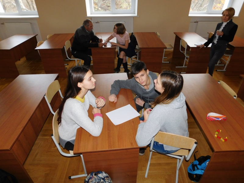 Після основної зустрічі школярі розділилися для участі у тренінгах. Крім тренінгу «Філософія дітям», викладачі кафедри соціальної роботи та психології підготували свої, не менш цікаві тренінги для учнів. Доц. Омельченко Л.М. неймовірно зацікавила учнів та дала їм можливість відчути себе у ролі студентів-психологів.