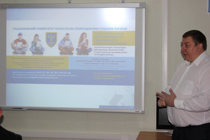 Під час зустрічі присутні прослухали інформацію про НУБіП України. Демонстрація відеофільму про НУБіП України дала змогу детально ознайомити майбутніх абітурієнтів із переліком інших спеціальностей, військовою кафедрою, умовами навчання, перспективами працевлаштування, а також міжнародними програмами обміну між НУБіП України і університетами-партнерами.