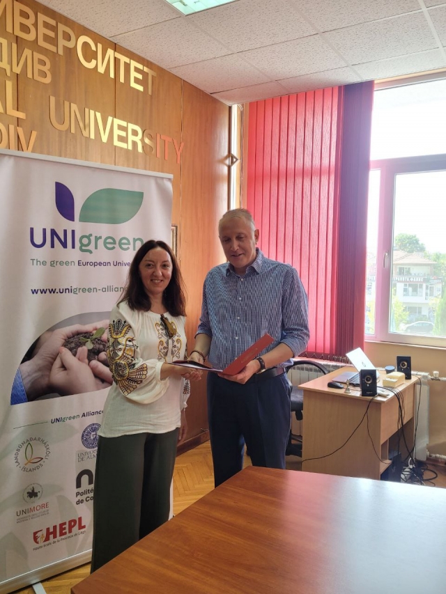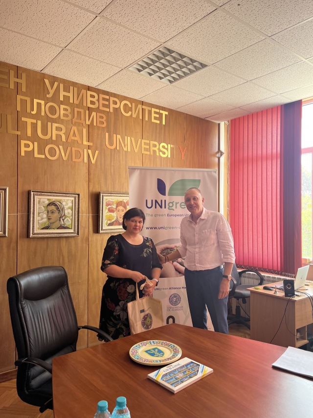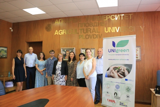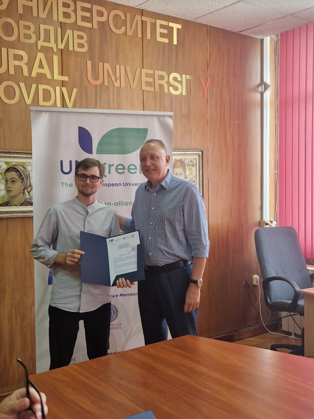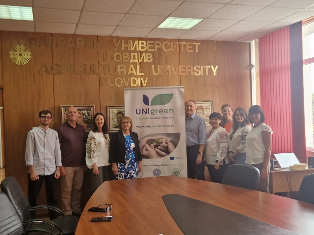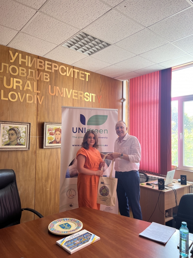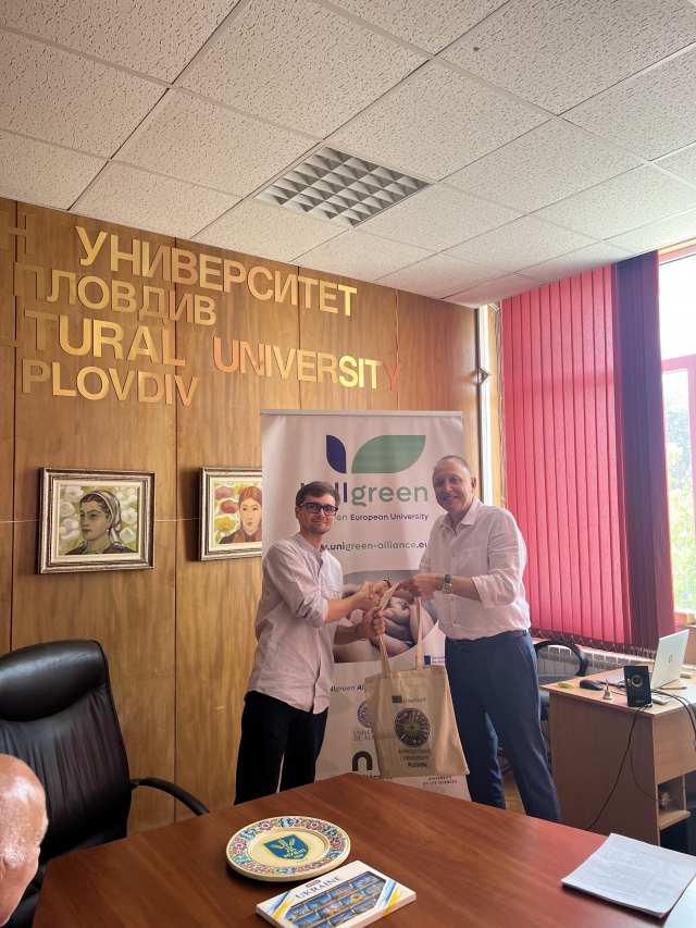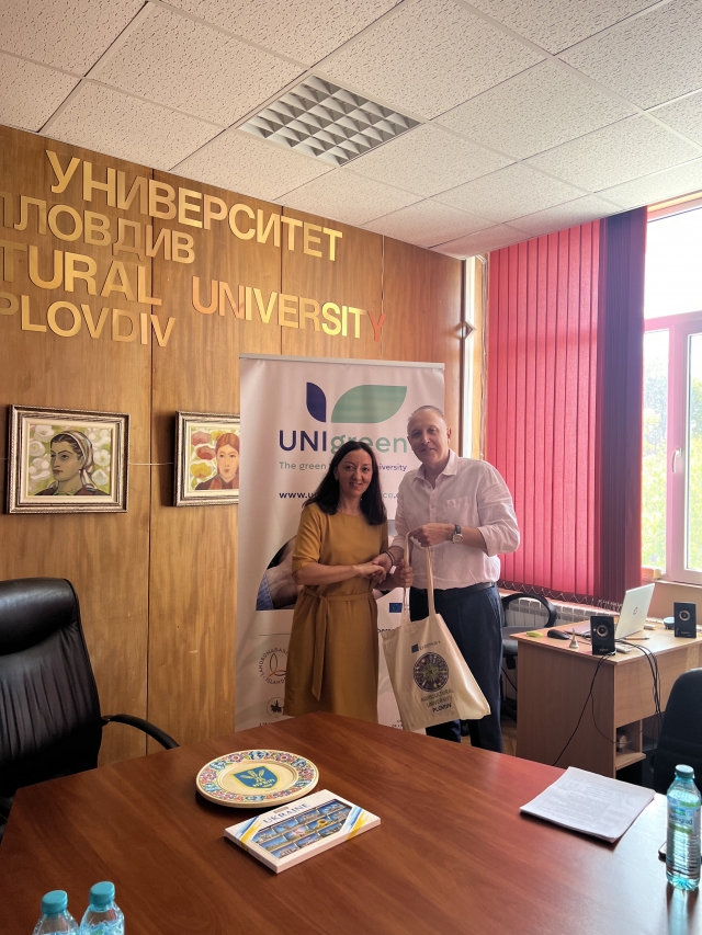 З 18 по 23 вересня 2023 року, в рамках Європейського альянсу проєкту UNIgreen, представники НУБіП України завідувач кафедри загальної екології, радіобіології та безпеки життєдіяльності, доктор біологічних наук, старший науковий співробітник Алла Клепко, доцент кафедри загальної екології, радіобіології та безпеки життєдіяльності, кандидат сільськогосподарських наук, старший науковий співробітник Валерія Бондарь, доцент кафедри статистики та економічного аналізу, кандидат економічних наук Леся Воляк, доцент кафедри електротехніки, електромеханіки та електротехнологій, кандидат технічних наук Дмитро Сорокін пройшли стажування в Аграрному Університеті Пловдів (Болгарія).