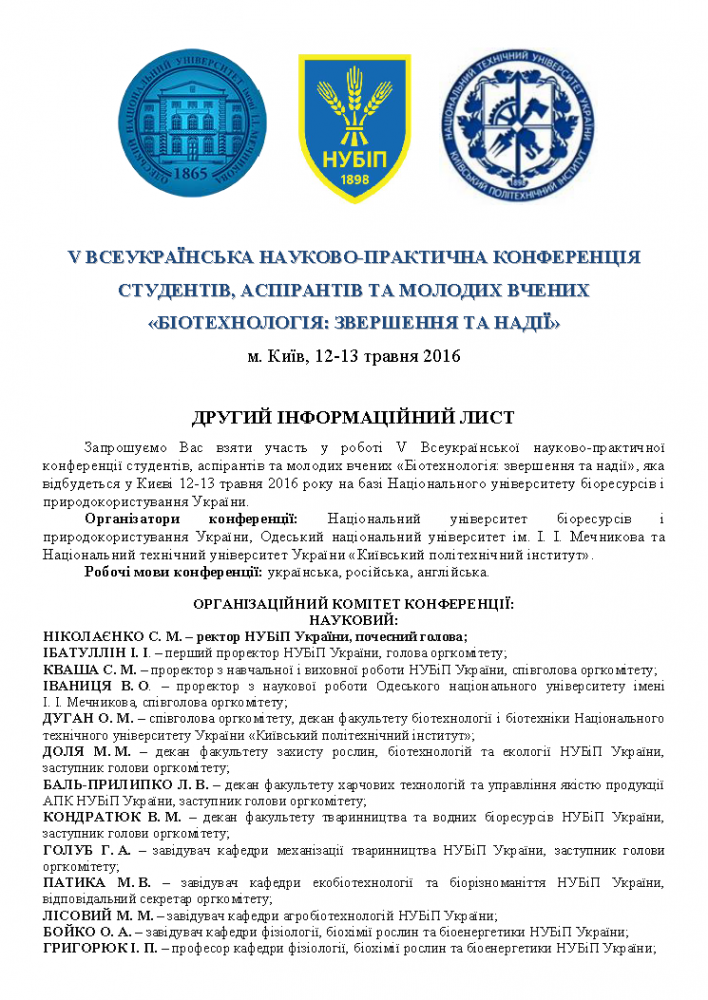 V ВСЕУКРАЇНСЬКА НАУКОВО-ПРАКТИЧНА КОНФЕРЕНЦІЯ СТУДЕНТІВ, АСПІРАНТІВ ТА МОЛОДИХ ВЧЕНИХ «БІОТЕХНОЛОГІЯ: ЗВЕРШЕННЯ ТА НАДІЇ» пт, 1 кві 2016 - 03:00