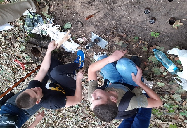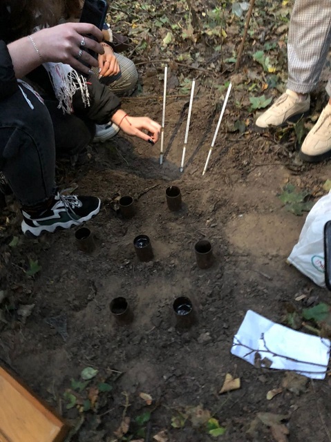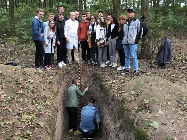 Рис. Ознайомлення із профілем ясно-сірого лісового ґрунту та підготовка до відбору зразків для аналітичних досліджень