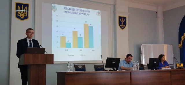 Наступним запитанням порядку денного був звіт про підсумки літньої екзаменаційної сесії студентів спеціальностей: “Технологія виробництва і переробки продукції тваринництва” та “Водні біоресурси та аквакультура” за 2022-2023 навчальний рік та шляхи по покращенню навчання студентів, який представив заступник декана з навчальної роботи Микола Войналович.