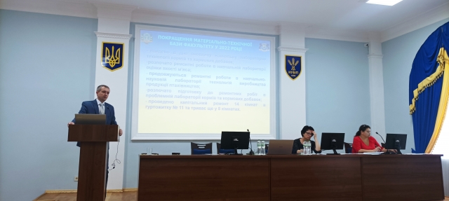 Потому колектив заслухав доповідь декана Руслана Кононенка щодо основних пунктів життєдіяльності факультету у 2021‒2022 навчальному році та окреслив нові завдання та виклики на 2022‒2023 навчальний рік. Він зазначив що колектив факультету постійно працює на підвищення рівня навчальної, навчально-методичної, інноваційної, виховної роботи, покращення матеріально-технічного забезпечення кафедр, навчальних та наукових лабораторій, міжнародної діяльності. Так, введено в дію оновлену навчальну лабораторію технології кормів та кормових добавок; розпочато ремонтні роботи в навчальній лабораторії оцінки якості м’яса; продовжуються ремонтні роботи в навчально-науковій лабораторії технологій виробництва продукції птахівництва; розпочато підготовку до ремонтних робіт в проблемній лабораторії кормів та кормових добавок; проведено капітальний ремонт 14 кімнат в гуртожитку № 11 та триває ще у 8 кімнатах. Основну увагу Руслан Володимирович звернув на надзвичайно складні умови в яких проходить вступна компанія. На завершення свого виступу Він зазначив, що кожен науково-педагогічний працівник повинен розуміти, що його професія пов’язана із постійним самовдосконаленням, навчанням протягом усього життя, кожен повинен бути професіоналом своєї справи, пишатися своєю роботою.
