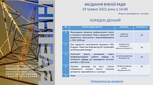 Готуючись до засідання вченої ради ННІ енергетики, автоматики і енергозбереження НУБіП України, інколи до плану роботи вносяться корективи з огляду на нагальність розгляду того чи іншого питання. До порядку денного травневого засідання вули включені дуже важливі питання.