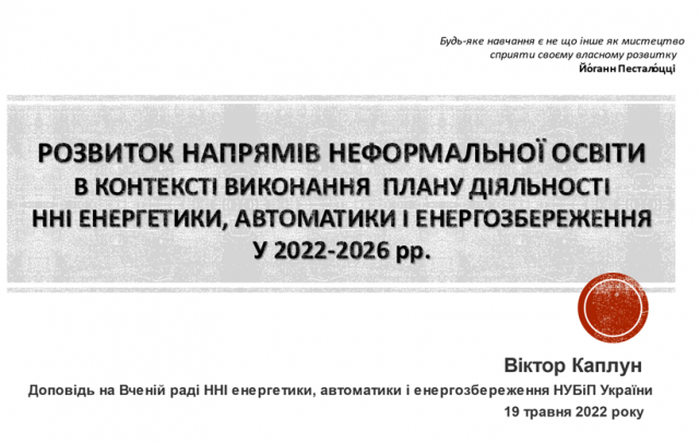 Заслухавши доповідь директора ННІ енергетики, автоматики і енергозбереження Віктора Каплуна «Формування напрямів неформальної освіти в контексті виконання Плану діяльності ННІ енергетики, автоматики і енергозбереження 2022-2026 рр.» вчена рада ухвалила рішення про створення в інституті впродовж 2022-2023 н.р. навчальної платформи неформальної освіти шляхом розроблення та створення навчально-методичного забезпечення, електронного ресурсу неформальної освіти за аналогією навчального порталу НУБіП України.