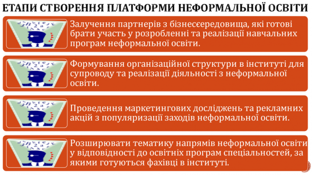 Неформальна освіта може стати полігоном для випробування сучасник методик та інструментів, котрі згодом можуть бути використані для формування дисциплін наявних освітніх програм.