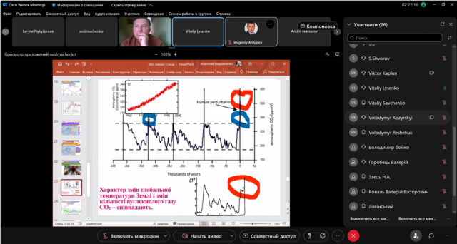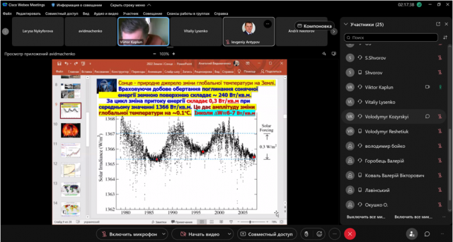 Далі професор кафедри фізики Анатолій Відьмаченко презентував надзвичайно цікаву наукову доповідь на тему: «Зміни глобального клімату Землі, Сонячна активність і врожайність с.г. культур».